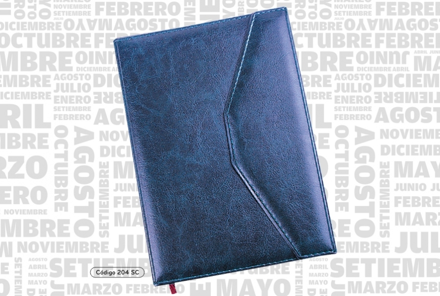 Tapa cosida a hilo con solapa triangular, broche imantado, bolsillo, porta bolígrafo.