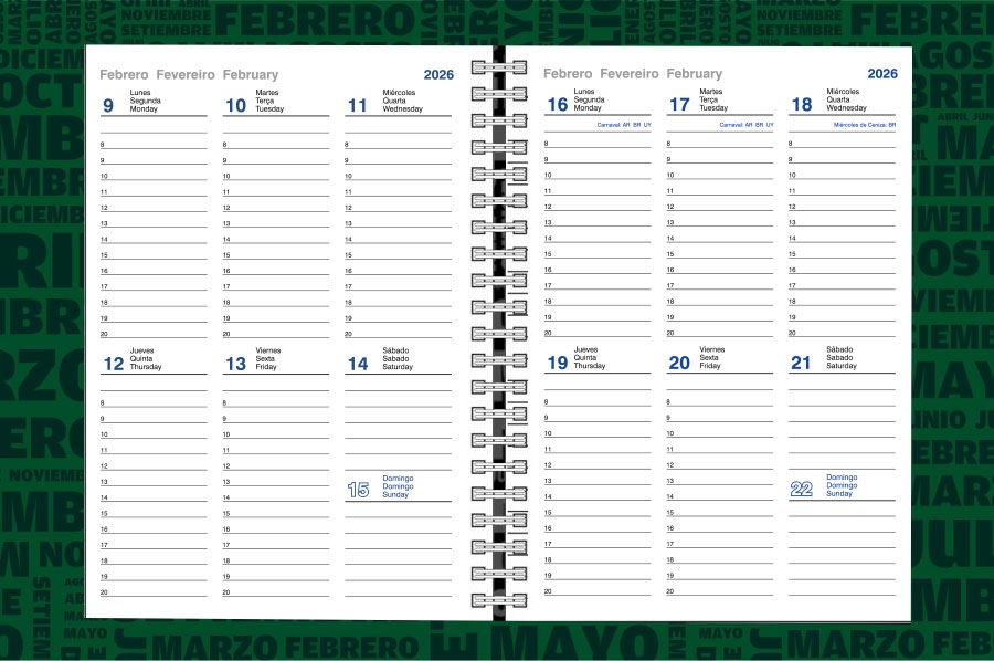Una semana por página. Papel blanco, impresas a 2 tintas.