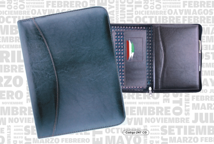 Dossier con cierre, bolsillos interiores, porta tarjetas, porta bolígrafo.